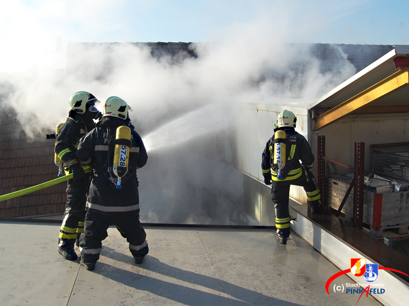Sofort wurde ein Atemschutztrupp (ULF) mit einem Schlauchpaket zur Brandbekämpfung vor geschickt. Die Löschwasserversorgung wurde von der Mannschaft des ULF von einem Hydranten selbst hergestellt. Danach wurde auch ein zweites C- Rohr in Stellung gebracht. Das RLF bezog auf der Rückseite der Industriehalle Stellung. Ein zweiter ATS- Trupp (RLF) wurde zur Brandbekämpfung in die Halle geschickt. Das LF Pinkafeld stellte die Löschwasserversorgung zum RLF her und stellte die Atemschutzreserve. Bei näherer Erkundung stellte der Einsatzleiter eine Photovoltaikanlage am Dach des Brandobjekts fest. Der ATS- Trupp in der Halle wurde daraufhin hingewiesen auf geschmolzene Kabel besonders aufzupassen. Eine Anrainerin erlitt eine Rauchgasvergiftung. Sie wurde von Rettungssanitätern der Feuerwehr Pinkafeld mit Sauerstoff versorgt und anschließend mit der Rettung ins Krankenhaus Oberwart eingeliefert. Nach ca. einer Stunde konnte der Brand unter Kontrolle gebracht werden. Bei den Nachlöscharbeiten wurden mittels Wärmebildkamera Glutnester aufgespürt und gelöscht. Danach konnte endgültig „BRAND AUS“ gegeben werden. Nach ca. zwei Stunden konnte wieder eingerückt werden. Die Stadtfeuerwehr Pinkafeld bedankt sich bei allen für die gute Zusammenarbeit.